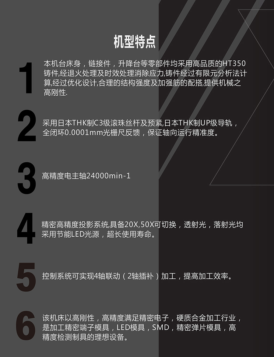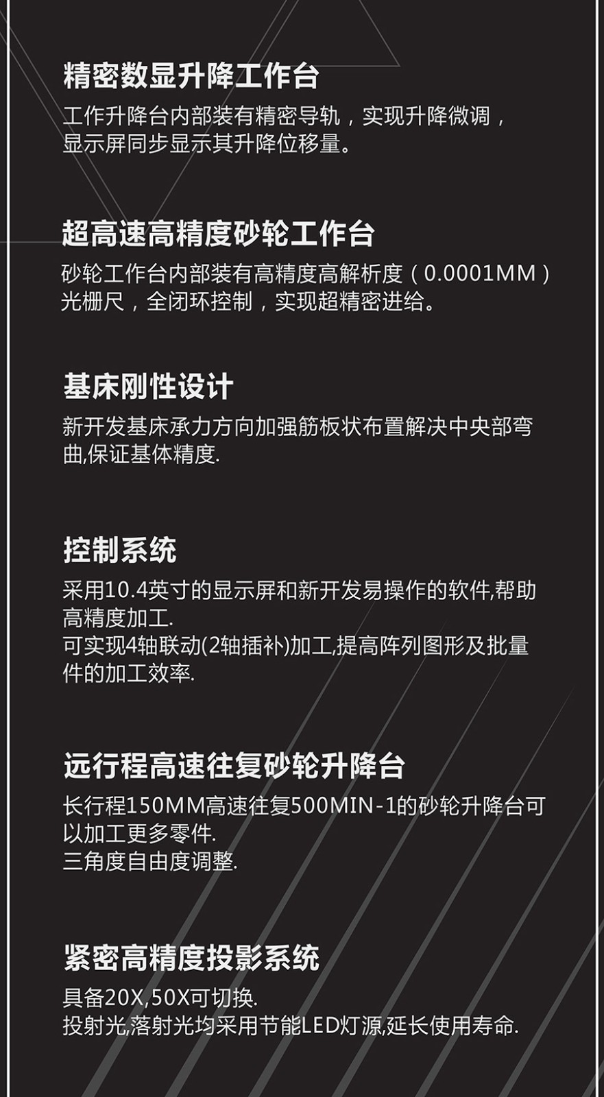 Menu产品展示PRODUCT DISPLAY 影像曲线磨床CCD80H 光学曲线磨床OPG150 数显曲线磨床DPG150 数显曲线磨床DPG150AT 胶片机 推荐产品 →影像曲线磨床CCD80H →光学曲线磨床OPG150 →数显曲线磨床DPG150 产品展示 现在:首页>>产品展示 胶片机 类别:产品展示 描述:本机台床身,链接件,升降台等零部件均采用高品质的HT350铸件,经退火处理及时效处理消除应力,铸件经过有限元分析法计算,经过优化设计,合理的结构强度及加强筋的配搭,提供机械之高刚性。采用日本THK制C3级滚珠丝杆及预紧,日本THK制UP级导轨全闭环0.0001mm光栅尺反馈,保证轴向运行精准度。 产品规格 联系我们 产品介绍 相关的 胶片机 数显曲线磨床DPG150AT 数显曲线磨床DPG150 光学曲线磨床OPG150 影像曲线磨床CCD80H